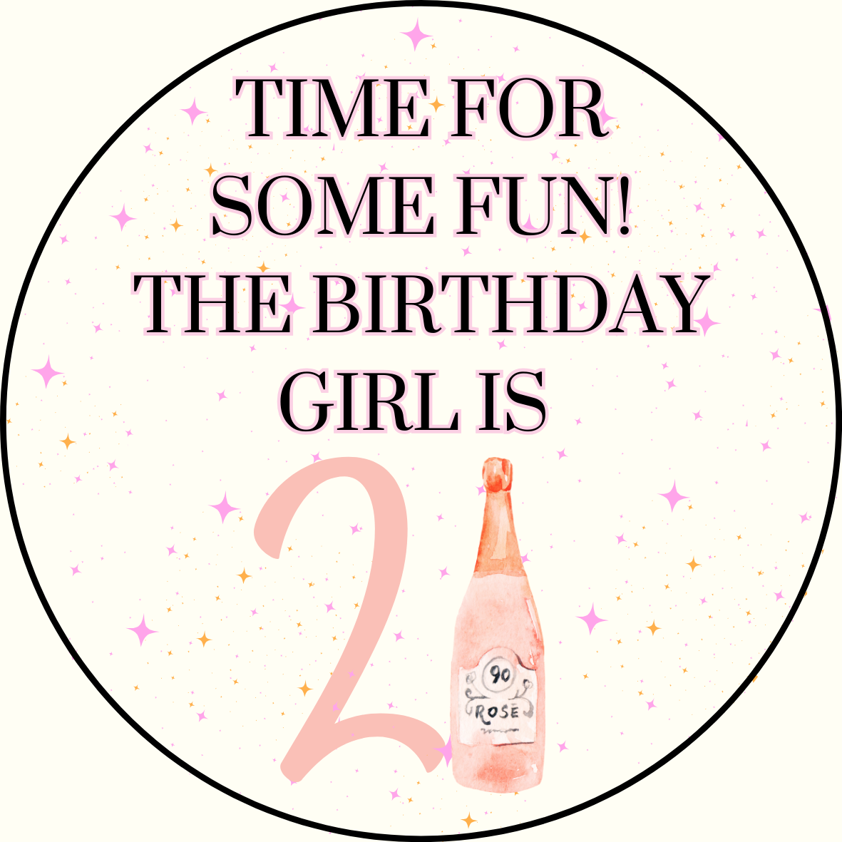 3" Button that reads "Time For Some fun, The Birthday Girl is 21" with a confetti backdrop.