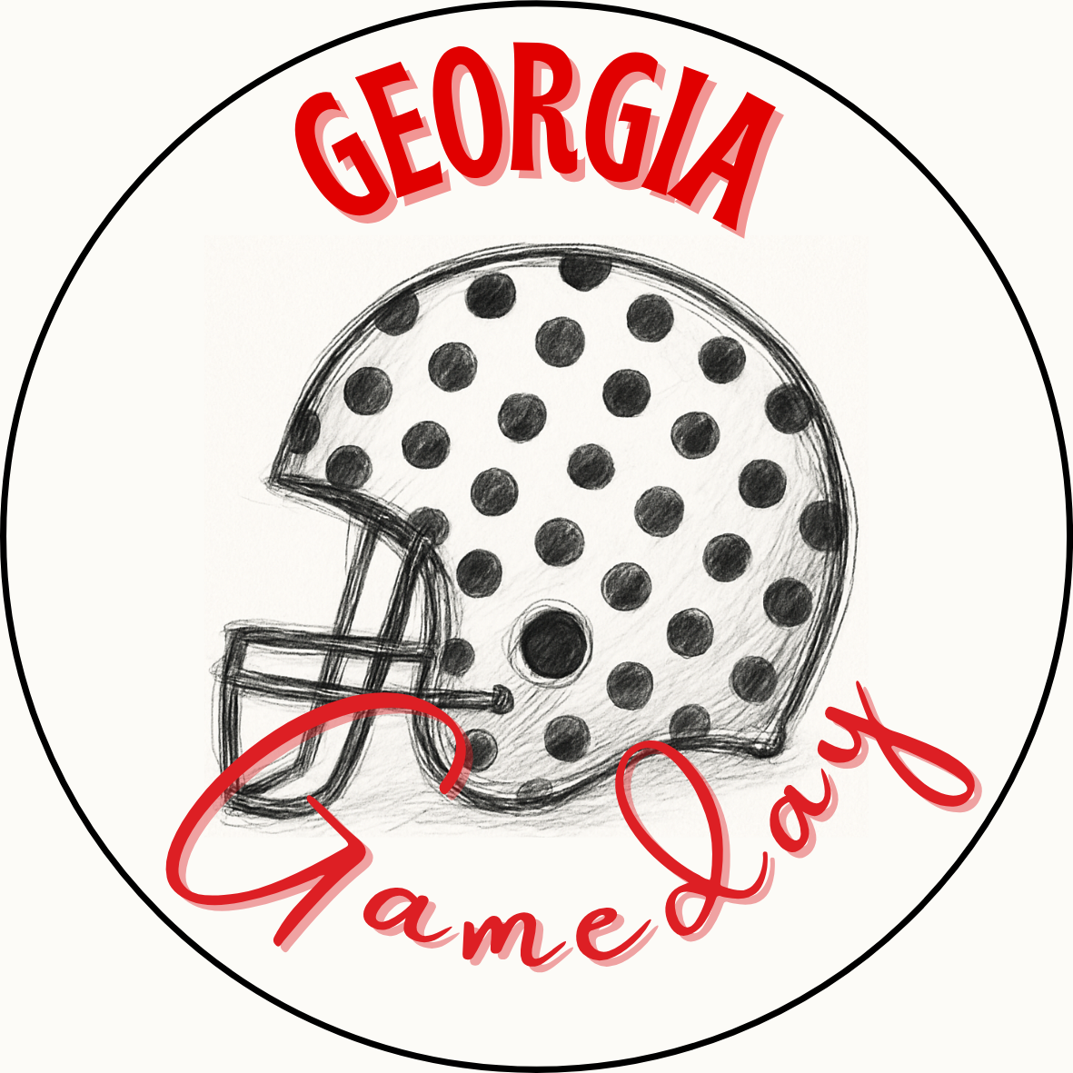 3" Matte Vinyl Sticker that reads "Georgia Gameday" and a football helmet with polka dot embellishments.